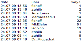 ich habe mir eben mal die Muehe gemacht und habe nochmal gezaehlt welcher User wieviele Nodes das letzte mal angefasst hat. Interessant ist das die zahl der Mapper in OWL seit Februar um 204 von 511 auf 715 angestiegen ist. Ein talk auf der "State of the Map" sprach allerdings von erstaunlich hohen "Churn Rates" um es auf Neudeutsch auszudruecken. Damit sind vermutlich von den ~700 Mappern mal gerade 10% wirklich aktiv. Leider finde ich den Vortrag und die Zahlen nicht mehr.