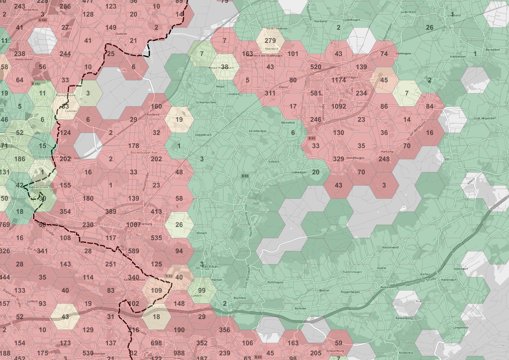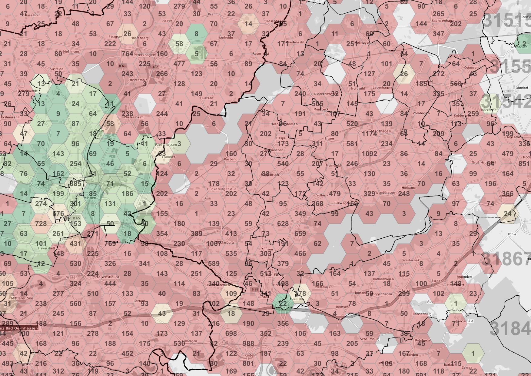 Hier schnell als jpeg .. Die Zahl in den Hexagonen ist die Anzahl der fehlenden Adressen (Stimmt nicht immer zu 100% aber so als indikator)