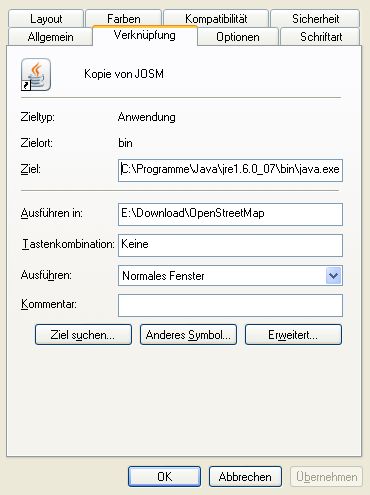 Hallo Ansgar, ich habe mir für JOSM eine Verknüpfung auf dem Desktop erstellt (siehe Anlage). Unter "Ziel" trägst du dann den Programmaufruf wie von Rafael beschrieben ein: "C:\Program Files\Java\jre6\bin\javaw.exe" -Xmx384M -jar D:\josm\josm-latest.jar Unter "Ausführen in" den Pfad zu josm-latest.jar: D:\josm Ist im Prinzip die gleiche "Dumpfbacken-Methode" wie von Ana Luisa beschrieben, nur das hier die kompletten Pfade zu den Dateien direkt mit angegeben werden. Damit dürfte man sich einen Eintrag in der Path-Variablen ersparen können. Wenn du statt javaw.exe java.exe einträgst, geht zusätzlich ein DOS-Fenster auf, in dem du die Hintergrundmeldungen von JOSM siehst. Viel Erfolg. Gruß Carsten