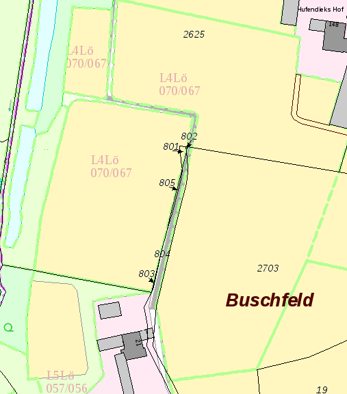 Der Flurstück-Streifen vor Haus 21 der den ungefähren Wegverlauf wiedergibt beginnt bei Haus 15 und geht dann komplett am Grundstück vorbei und weiter zwischen den Feldern. Das sagt uns jetzt zwar noch nichts über die Besitzsverhältnisse, aber ich vermute:
