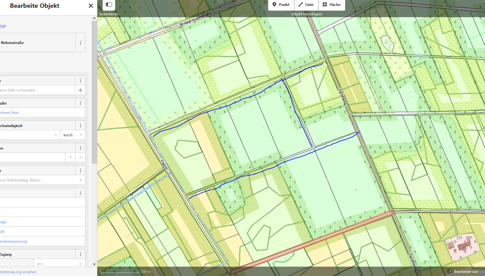 (Syntax usw. siehe z.B. https://wiki.openstreetmap.org/wiki/Overpass_API/Overpass_QL ) ) Ich wäre etwas zurückhaltend, Wege einzutragen, die ich nicht klar selbst gesehen habe. Auf den Satellitenbildern sehe ich zwar Auffahrten auf Felder und Fahrtspuren, wäre aber nicht zwingend sicher, ob es sich um Wege handelt oder nur um Treckerspuren, die in einem Jahr mal so, in einem anderen mal so verlaufen. Ich kenne mich mit den ALKIS-Daten (ich glaube, das ist Dein gewähltes Hintergrundbild?) jetzt nicht so gut aus, dass ich beurteilen könnte ob man von der Karte eindeutige auf Wege schließen kann. Das können aber andere hier besser. Es gibt übrigens tatsächlich auch mal Wege, bei denen es einen Sinn hat, dass sie wieder gelöscht wurden, z.B. bei unerlaubten Trampelpfaden durch Naturschutzgebiete. Insbesondere, wenn die Wege nicht klar als unerlaubt eingetragen sind, ist das auch ziemlich lästig und kann Ärger geben (und sei es nur der Ärger des Kartennutzers, der eine Route vor Ort dann doch anders planen muß, weil eine Abkürzung vielleicht doch keine so gute Idee ist.) Bei den Editoren kannst Du natürlich nur Objekte, die im Datenbestand von OSM sind, anwählen, und nichts, was nur Hintergrundgraphik ist. Grüße, Sebastian Am 09.10.23 um 07:50 schrieb Lennart Schwan: